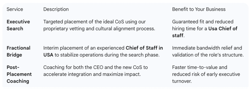 • Focus on the CEO-CoS Dynamic: We prioritize the alignment between the CEO and the candidate, recognizing that trust and chemistry are non-negotiable for success in the Chief of Staff in USA role.